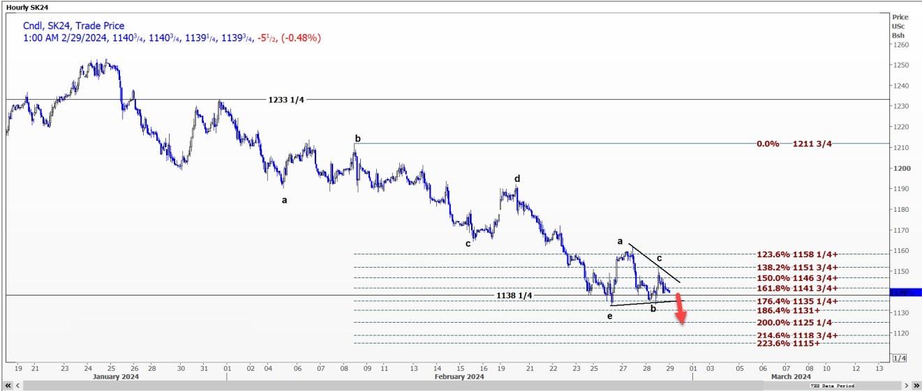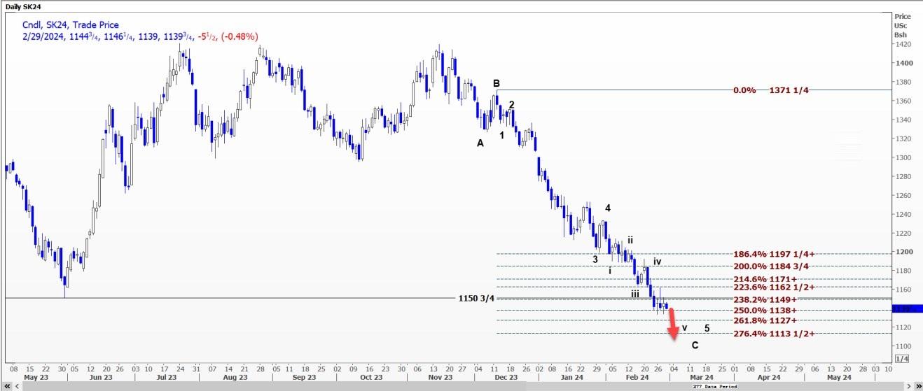 CBOT美豆5月合约SK24可能突破每蒲式耳11.3525美元的支撑位,跌至11.2525美元至11.31美元区间。