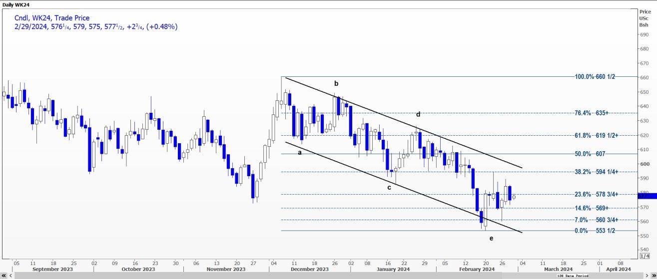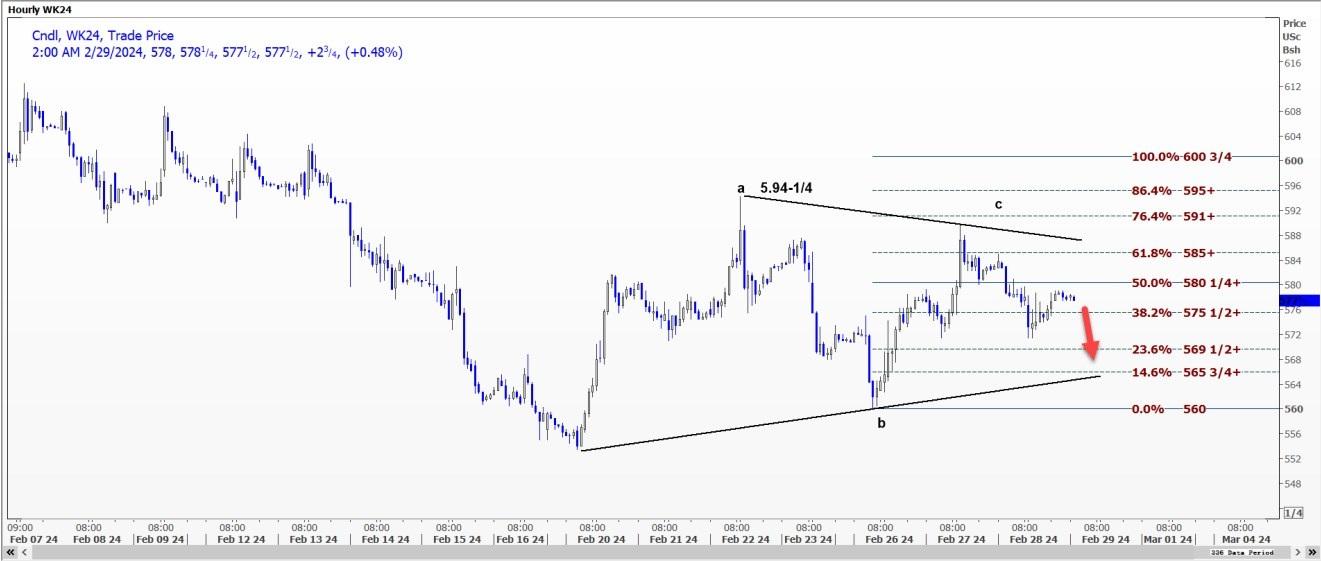 CBOT 5月美小麦WK24倾向于重新测试每蒲式耳5.6950美元的支撑位,因为它似乎正在楔形内盘整。