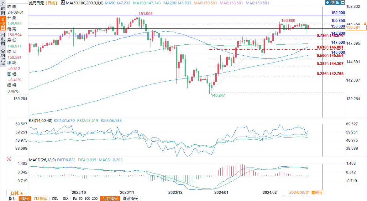 汇通财经APP讯——周五(3月1日)日元走弱。截至北京时间16:00,美元/日元报150.491/503,涨幅0.35%,欧元/日元报162.708/731,涨幅0.41%,英镑/日元报190.067/101,涨幅0.41%。