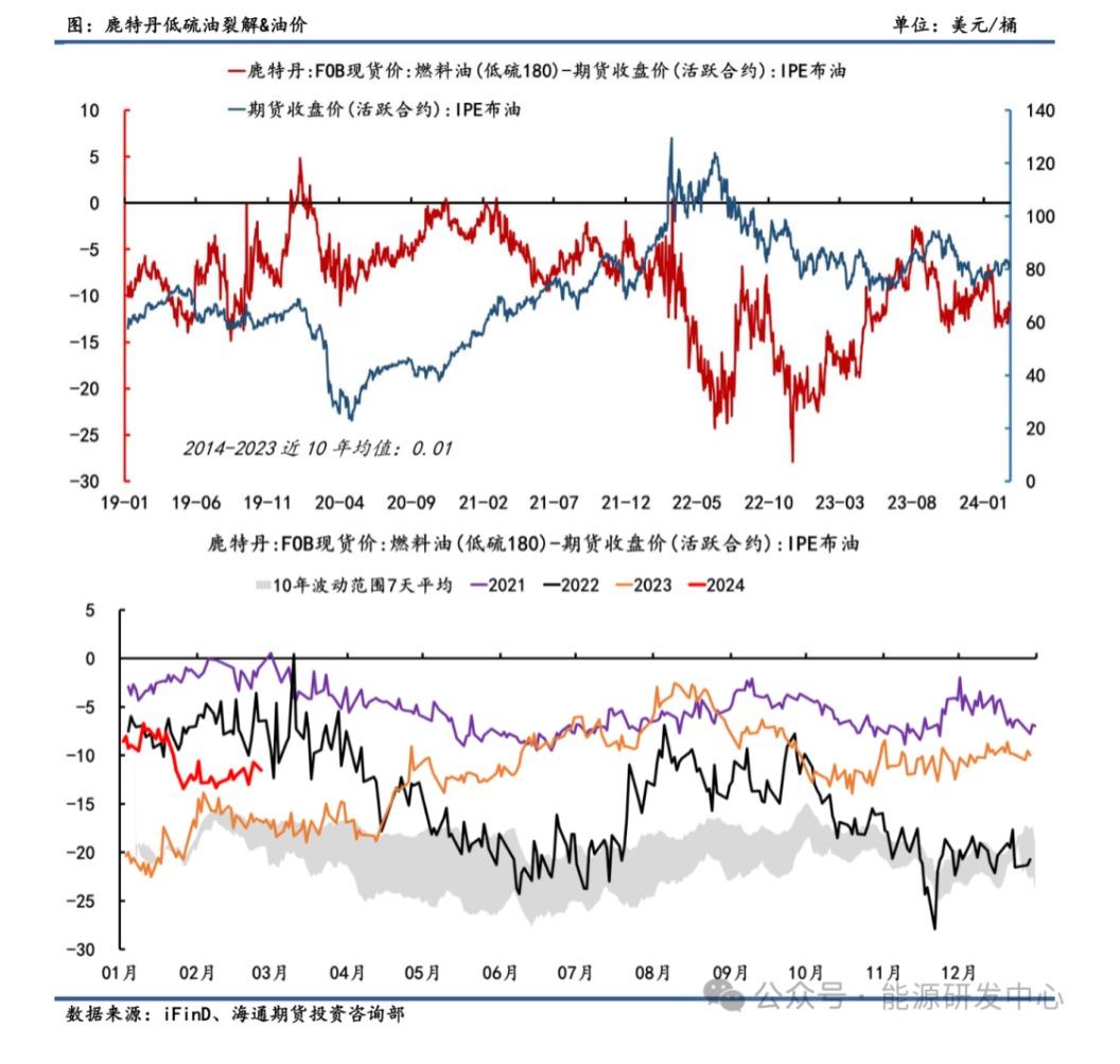 从长周期来看,低硫油裂解与Brent原油走势同样呈负相关。其传导路径与高硫油一致,即跟随原料端走,用来做正向指标的指示性弱。24年开年以来,鹿特丹低硫燃料油裂解低位震荡,油价反弹回暖约束利润空间。截止2月26日,鹿特丹FOB 180低硫油-Brent价差录得-11.55美元/桶,与近10年均值水平0.01美元/桶相比差距较大,未来或逐渐回归均值线。