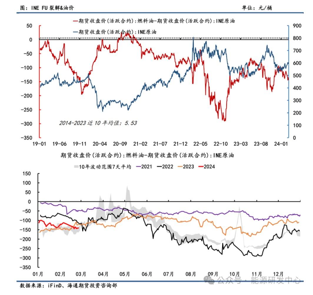 从长周期来看,INE FU燃料油裂解与SC原油走势呈负相关。其传导路径与新加坡高硫油一致。24年开年以来,FU燃料油裂解震荡下滑,油价反弹回暖约束利润空间,且正处于中国春节期间高硫油加注需求进入淡季。截止2月26日,FU-SC价差录得-140.4元/桶,偏离近10年均值水平5.53元/桶差距较大,处于历史估值绝低位置。