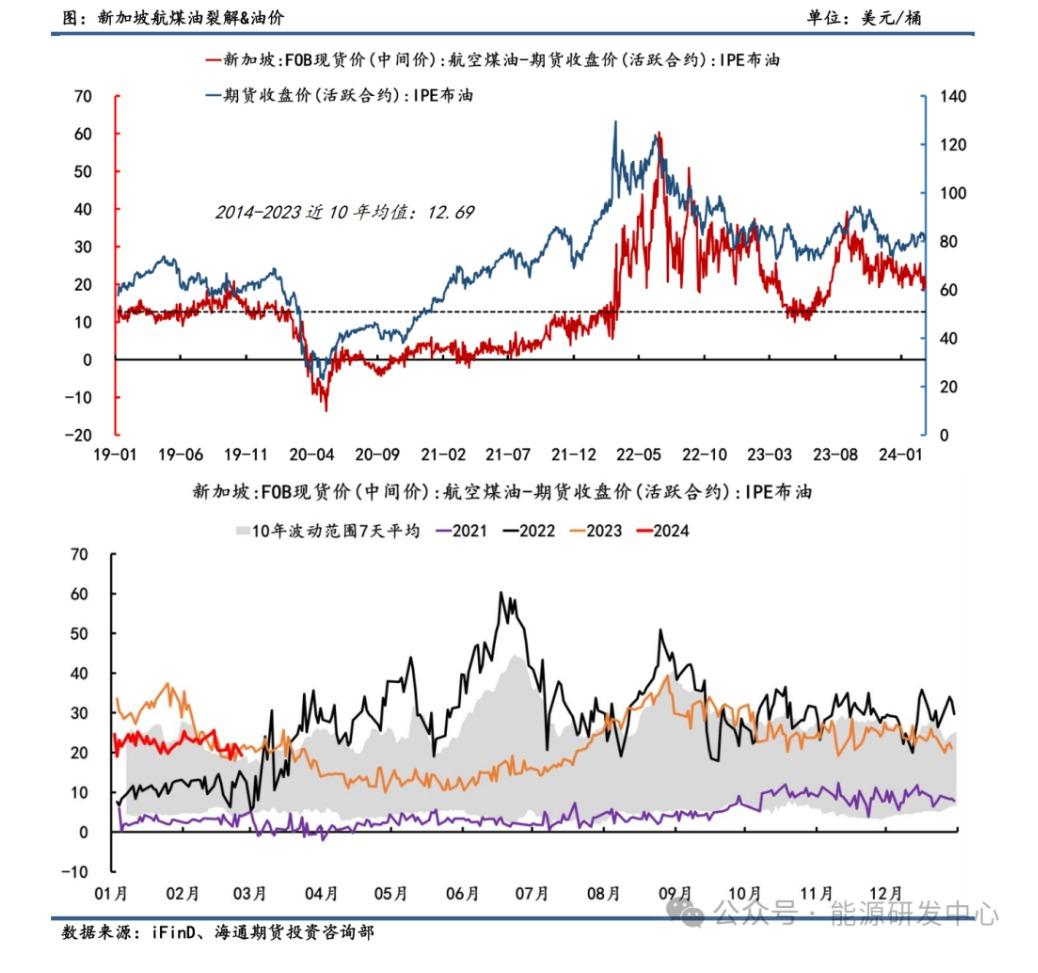 从季节性来看,新加坡航煤-Brent价差季节性规律偏弱。受新冠疫情影响以来,国际航班出行需求仍处于不断恢复中。2022年因俄乌冲突影响使得航煤裂解运行至历史高位。24开年以来,新加坡航煤-Brent价差在10年波动上方线维持震荡态势。相较于汽油和柴油裂解对油价的影响,航煤油裂解对油价带动相对弱些。