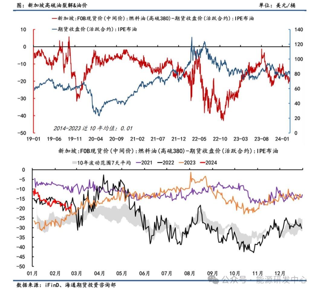 从长周期来看,高硫油裂解与Brent原油走势呈负相关。其传导路径遵循:在原料端价格上涨时,高硫油利润受到抑制;在原料端价格下跌时,高硫油利润有所打开。一般而言,高硫油裂解主要跟随原油端波动,用来做正向指标的指示性弱。从炼厂供给来看,高硫燃料油为副产品,其产量与全球炼厂开工率密切相关。24年开年以来,高硫燃料油利润震荡下滑,一方面由于油价反弹回暖;另一方面中国春节及美国炼厂检修使得高硫炼化需求疲软,新加坡高硫油库存维持高位,供需基本面偏宽松,裂解利润下滑明显。截止2月26日,新加坡FOB 308高硫油-Brent价差录得-17.92美元/桶,与近10年均值水平0.01美元/桶相比差距较大,未来或逐渐向均值回归。