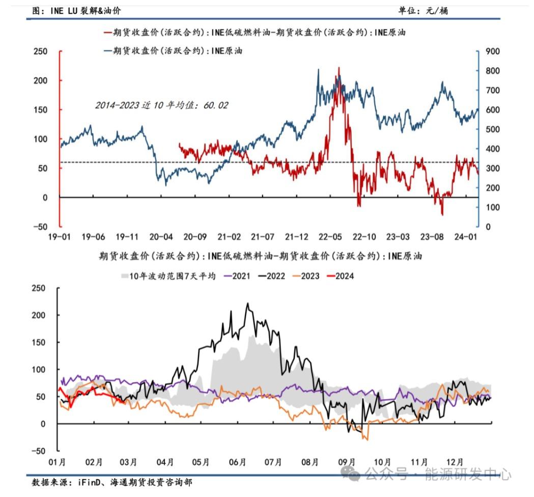从季节性来看,LU-SC价差季节性规律偏弱,但整体好于FU-SC价差表现。开年以来,LU裂解先跌后涨再跌,尽管春节期间终端需求偏清淡,但红海危机下国际航运市场船只绕航带动低硫加注需求尚可,LU价格仍表现坚挺。在整体燃料油供应相对充足下,其裂解仍然跟随油价波动,当油价出现反弹上升时,可以选择卖出裂解价差锁定现货利润。同时,由于LU裂解处于历史估值绝对位,回归空间仍需用时间换取。