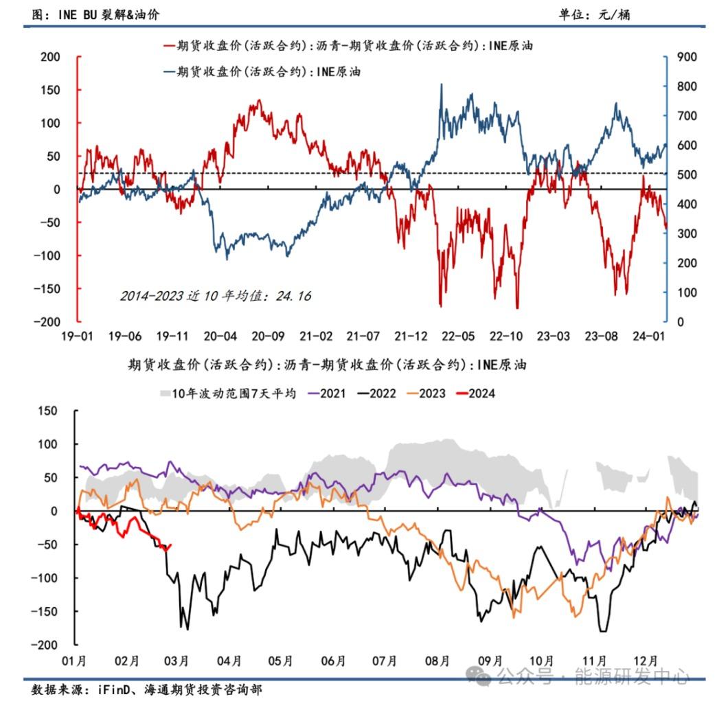 从长周期来看,INE BU沥青与SC原油走势呈高度负相关。作为原油下游副产品,沥青裂解跟随原油波动而波动。24年开年以来,由于正值沥青传统需求淡季及受各地寒冷天气影响,沥青价格弱势维稳,而油价反弹回暖约束裂解空间,BU沥青裂解震荡下滑。截止2月26日,BU沥青与SC价差录得-50.42元/桶,大幅偏离近10年均值水平24.16元/桶,处于历史估值绝低位水平。