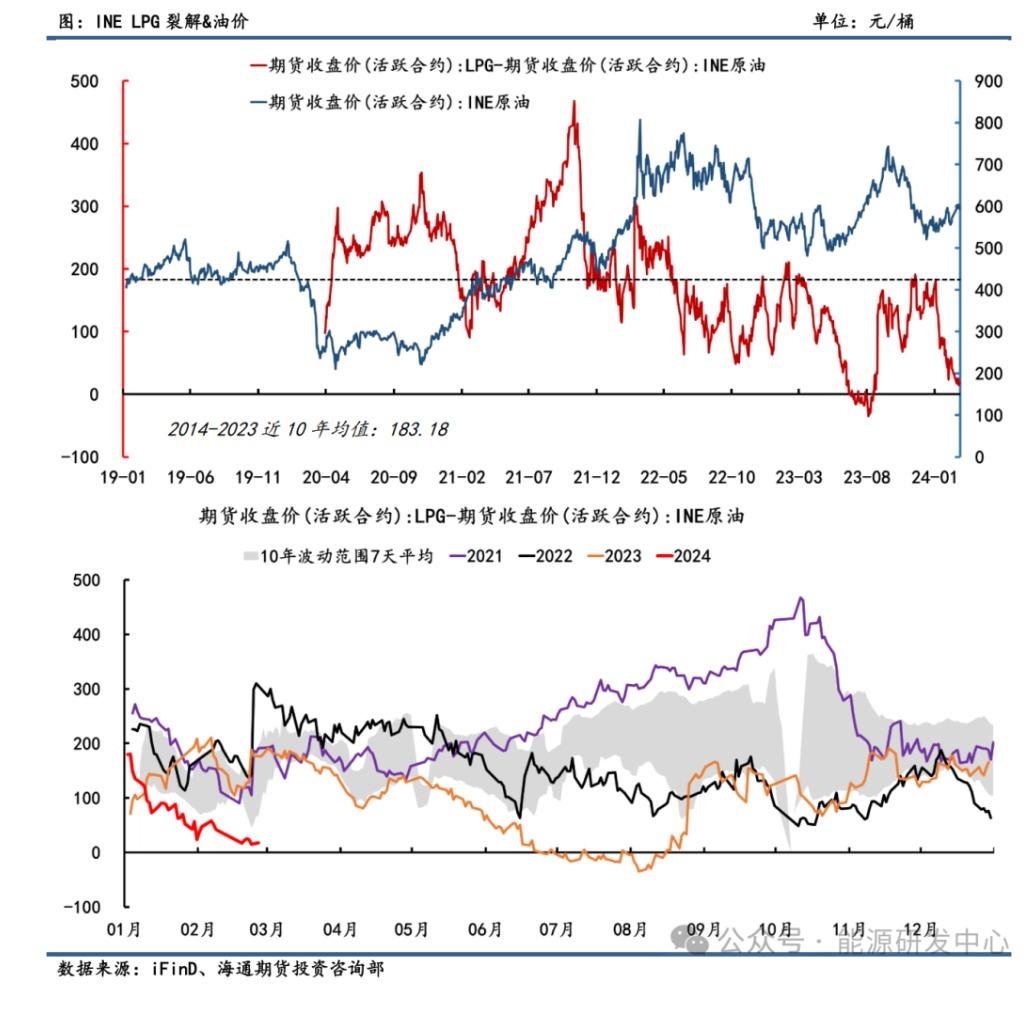 从长周期来看,在裂解方面,LPG-SC裂差与SC在某些时候并不一一对应相关,比如23年SC在11月期间持续回落,LPG-SC价差则高位震荡,主要由于巴以地缘冲突和巴拿马运河拥堵问题影响。24年开年以来,LPG-SC价差大幅滑落至历史低位,在巴拿马运河拥堵缓解和需求淡季影响下LPG价格面临回调风险,使得裂解空间大幅萎缩。截止2月26日,LPG-SC价差录得17.97元/桶,大幅偏离近10年均值水平183.18元/桶,处于历史估值绝低位水平。