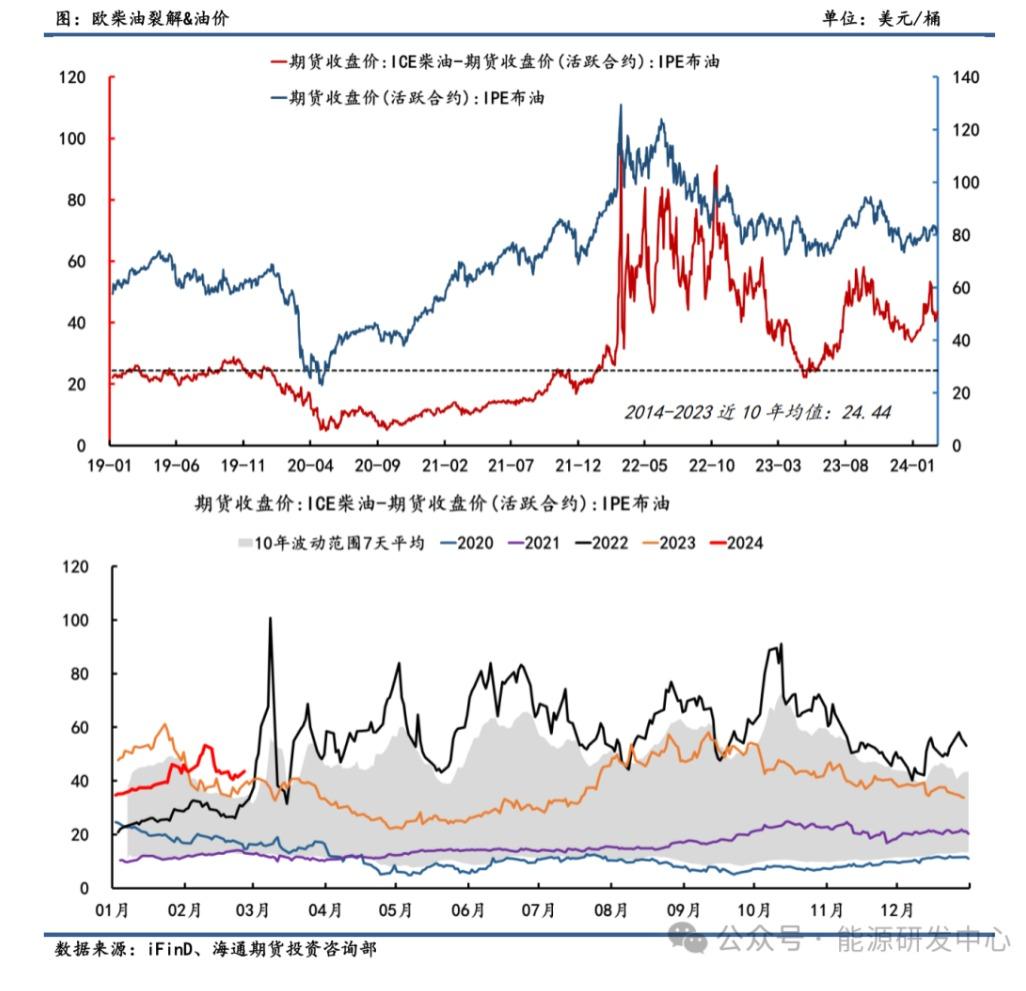 从长周期来看,相比于美汽油,欧柴油裂解与Brent走势强正相关。同样作为原油的下游,ICE柴油裂解与Brent同步性偏高,触底和见顶的时机相对一致(比如20年“负油价”低点,22年3月俄乌爆发后高点等),传导路径与美汽油一致,围绕利润打开推动需求进而推涨油价。24开年以来,ICE柴油-Brent价差走强至高位后出现回落,但仍震荡在相对高位区间。截止2月26日录得43.63美元/桶,与近10年均值水平24.44美元/桶相比超出近80%,处于历史强景气阶段。