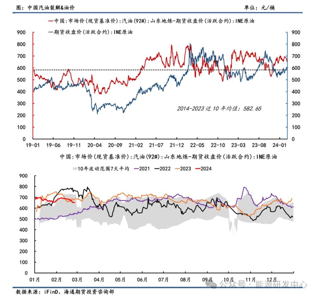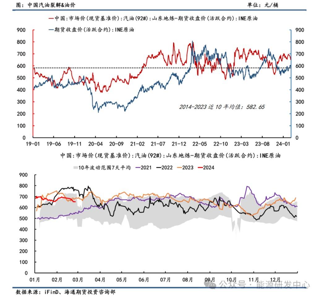 从长周期来看,中国92号汽油裂解可视为INE SC原油的先行指标,见顶或见顶一般较INE原油领先,其与美汽油裂解原理基本一致。24年开年以来,中国92号汽油裂解差高位震荡,截止2月26日,中国92号汽油-INE SC价差录得652.69元/桶,与近10年均值水平582.65元/桶相比高出近12%。春节前终端加油站备货以及春节后短期补货行情,汽油价格在春节前后整体走势偏强,带动裂解利润呈现上涨。而后随着短暂补货结束,终端加油站汽油需求转弱,裂差出现向下调整。