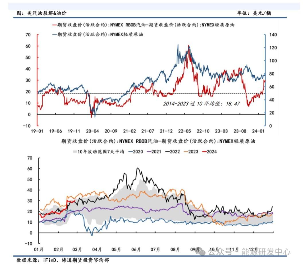 从长周期来看,在基本面维度上,美汽油裂解基本与WTI原油走势呈正相关。作为原油的下游,RBOB可作为WTI的先行指标(比如20年“负油价”先于油价触底,22年峰值先于油价见顶等),传导路径遵循:汽油裂解利润打开→炼厂原油需求上升→推动油价上涨,反之亦然。而当油价金融和地缘属性占据主导时,其与实际的裂解需求也会产生背离(比如23年3月银行业危机和9月巴以冲突影响等),但在其市场完全计价后,油价仍回归到裂解利润作用机制上。24开年以来,RBOB-WTI价差持续走强,截止2月26日录得30.07美元/桶,与近10年均值水平18.47美元/桶相比超出60%,处于历史强景气阶段。(之前的俄乌冲突结构性推动)