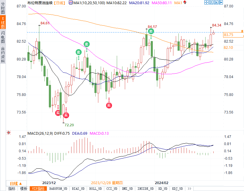 布伦特原油连续合约报83.73美元/桶,日内上涨0.18美元,涨幅0.22%,。