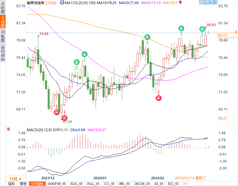 美原油连续合约站上80美元关口,为近4个月以来首次,报80.40美元/桶,日内上涨0.28美元,涨幅0.35%。
