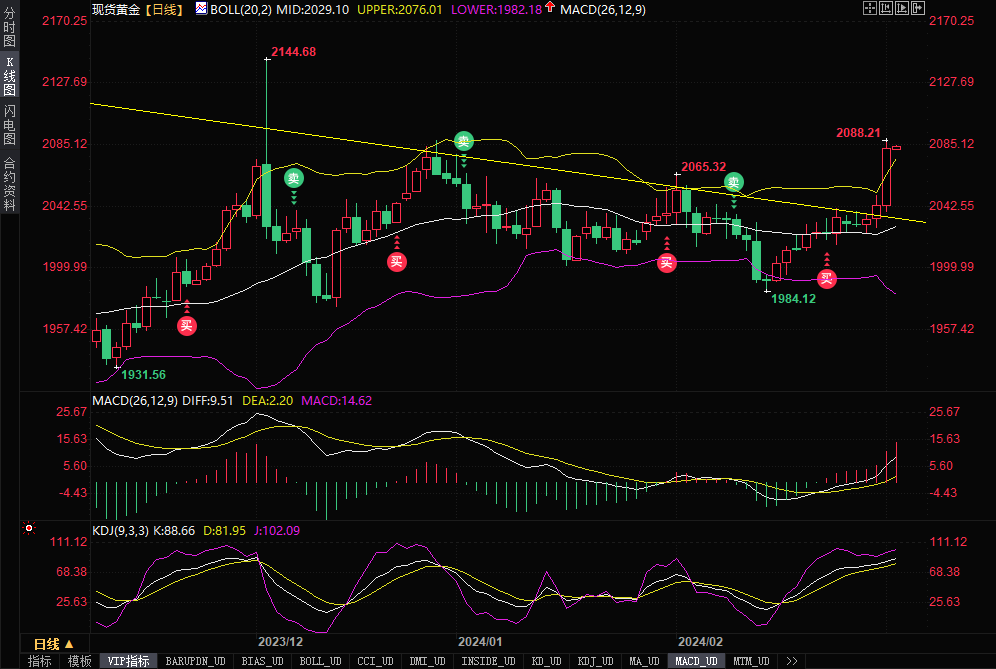 汇通财经APP讯——上周黄金疯狂爆发,周初整体在2030美元附近维持震荡格局,上周四在符合预期的PCE数据下一度拉升至2050美元,上周五更上一层楼,在疲弱美国数据的影响下暴涨近40美元,一度冲高至2088美元,最终收于2083美元,收创历史新高,收涨2%创两个半月最大涨幅。