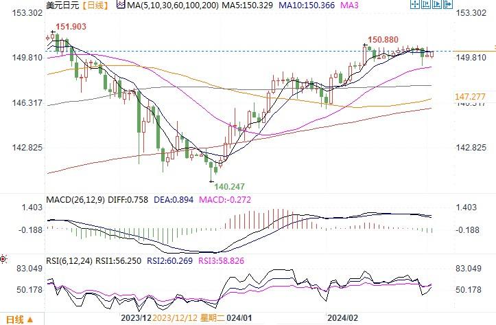 因此受挫,但美元在很大程度上仍处于区间震荡,交易商还在密切关注经济数据的进一步发展,以寻找美联储何时可能开始降息的新线索。周五当天,日本央行总裁植田和男表示,现在断定通胀率接近持续达到央行2%的通胀目标还为时过早,并强调有必要仔细研究更多有关工资前景的数据。通胀预期和日本央行的政策路径可能将取决于大型企业与工会就加薪问题进行的谈判。工资谈判将带来更多表明日本的通胀正变得更加持久的信号,那么市场预计日本央行将退出负利率政策。日本央行总裁周五稍显谨慎的表态,略微抑制了日元的表现。日线图上,美元/日元似乎存在尝试下穿布林带通道中轨线的倾向,各项技术指标也呈现开始下摆的倾向。若美元/日元近期收盘于150之下,那么日元存在着逆转跌势转而为升的走势。目前上方151的阻力看来不易穿过破。