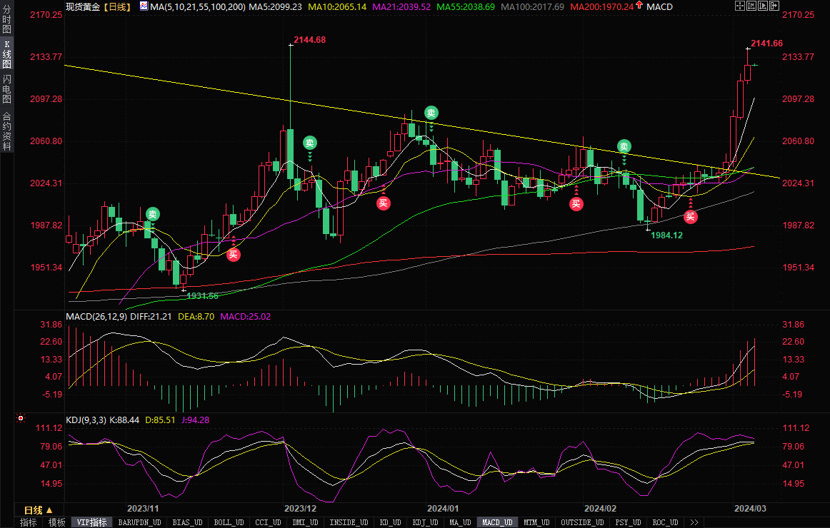 现货黄金窄幅震荡,目前交投于2166.89美元/盎司附近。周二金价继续上涨,日线录得六连阳,累计上涨逾100美元,收报2127.69美元/盎司,盘中最高曾触及2141.66美元/盎司,仅略低于12月4日创下的历史高点2144.68(部分平台当时高点为2135美元,意味着周二盘中创下历史新高),因美国ISM服务业PMI数据弱于市场预期,提升了美联储6月份降息预期,而且中东冲突进一步吸引避险买需。