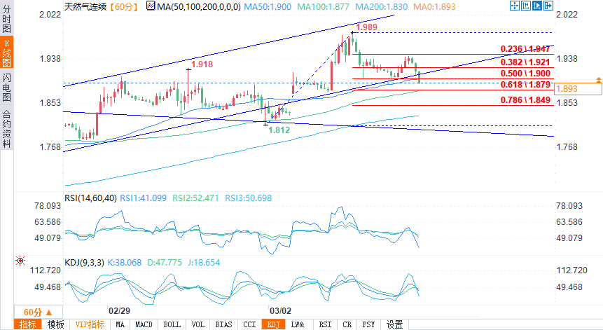 在1小时图中,天然气处于修正模式,价格跌破了通道支撑。价格正跌向61.8%回撤位1.87美元的水平,该水平和100期移动平均线对齐。