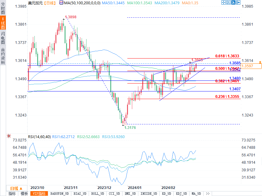 美元兑加元在上周晚些时候从1.3545的支撑位反弹后,周二继续上行。如果在接下来的几个交易日上涨势头增强,上方阻力位将逼近1.3620,这是2023年11月至12月暴跌的61.8%斐波那契回撤位。如果汇率进一步上涨,注意力转向1.3700。