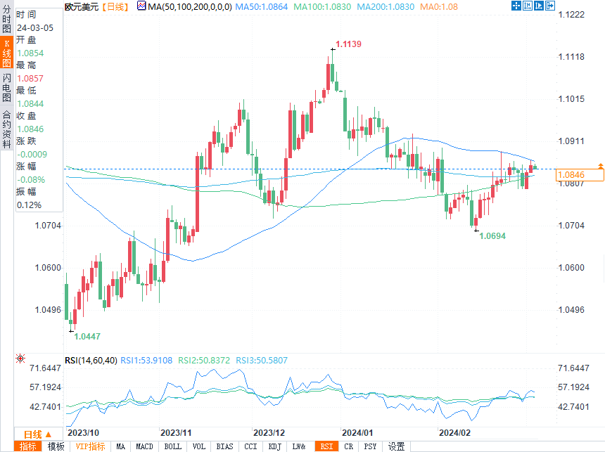 欧元兑美元接近其50日移动均线切入位1.0860。如果空方势头减弱,
