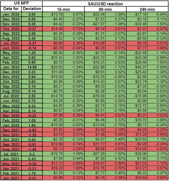我们绘制了非农数据发布后的15分钟、1小时和4小时内的黄金价格反应。然后,我们将黄金价格的反应与实际非农结果与预期结果之间的偏差进行比较。