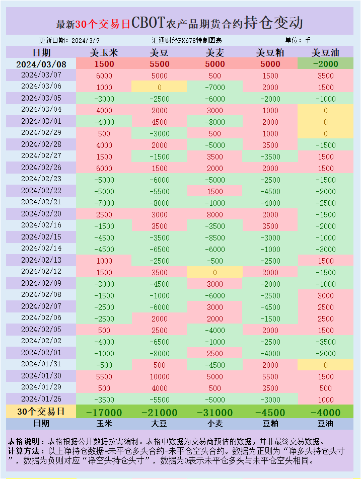全球粮食供应充足和出口业务的激烈竞争继续支撑着价格,但目前最糟糕的消息可能已被考虑到价格中。市场底部或已经形成。商品基金在这三种商品中均持有大量净空头头寸,使市场面临空头回补的局面。根据汇通财经观察,海外交易商估算的结果显示,本周五(3月8日),
