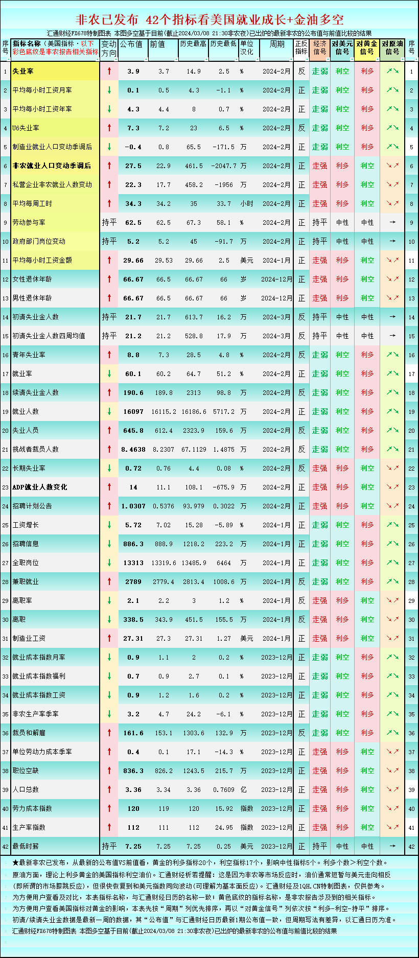 同向波动(可理解为基本面反应)。更多见汇通财经FX678特制图表 本图多空基于目前(截止2024/03/08 21:30非农夜)已出炉的最新非农的公布值与前值比较的结果。