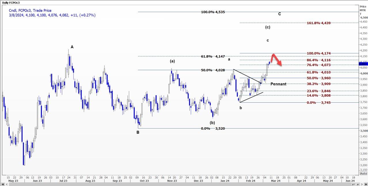 日线图上,三角旗形和来自3745林吉特的c浪的预测分析表明目标为4174林吉特。