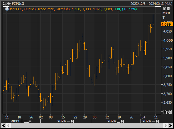 马来西亚衍生品交易所5月交割的基准棕榈油合约FCPOc3上涨18林吉特或0.44%,收于每吨4089林吉特(合873.34美元),为7月25日以来的最高收盘价。