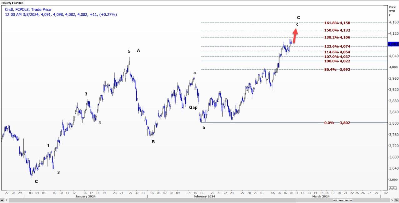 在强劲的c浪推动下,棕榈油FCPOc3可能会突破4106林吉特的阻力位,并攀升至每吨4106-4158林吉特的区间。