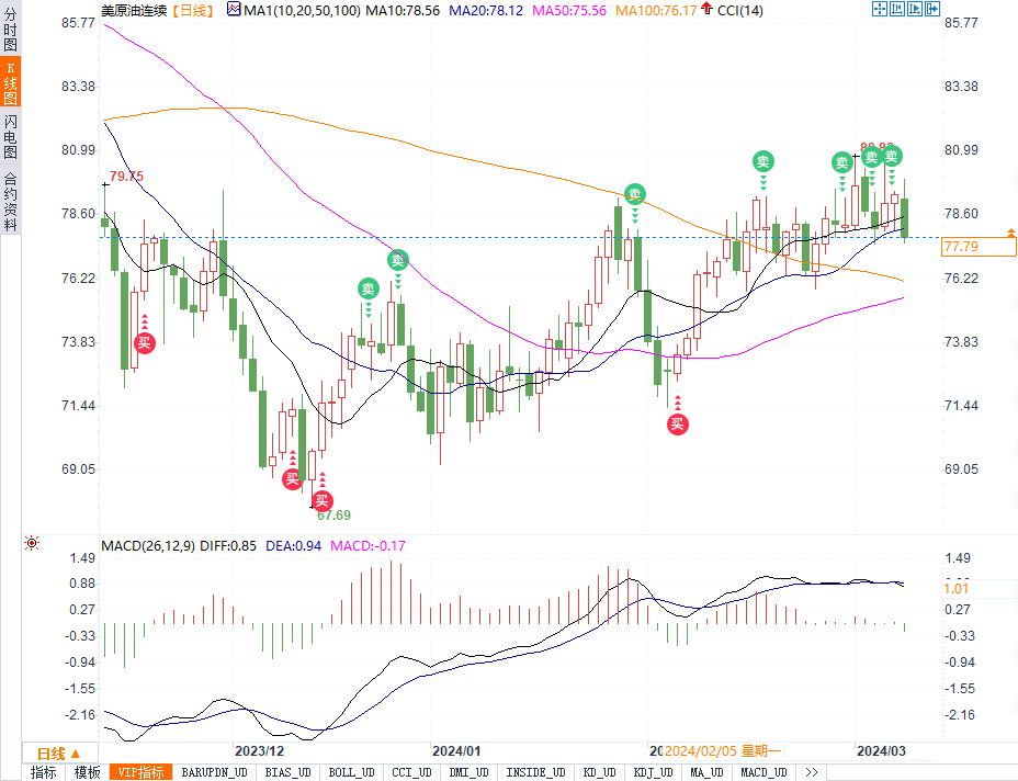 WTI 4月原油期货收跌1.08美元,跌幅近1.37%,收报77.84美元/桶。本周累计下跌2.46%。