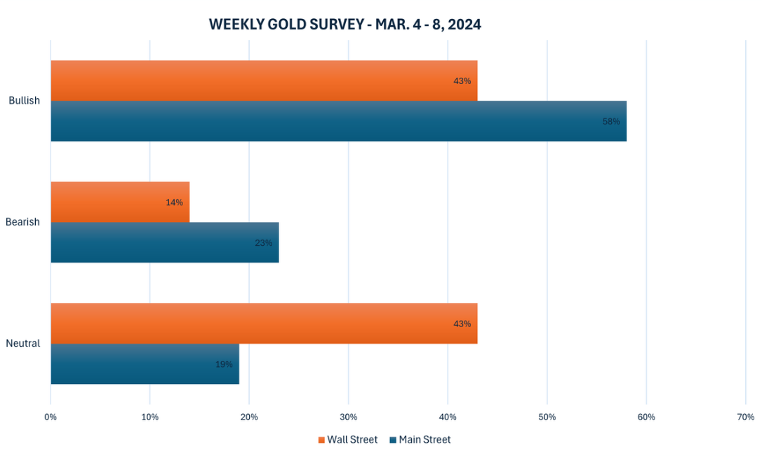 14 名分析师参与了Kitco News上周的黄金调查,乐观情绪主导了华尔街。6位专家(即 43%)预计未来一周金价将上涨,同样比例的专家预测金价将横盘整理。只有2位分析师(占 14%)预测贵金属价格会下跌。