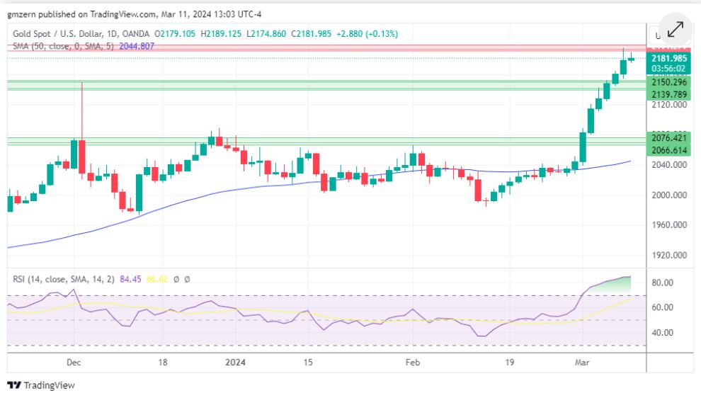 RSI处于超买区域,因此回调的风险正在增加。然而,如果突破2200美元/盎司的水平将为黄金提供获得额外上行动能的机会。