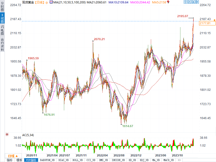 现货黄金上周五收盘上涨19.38美元,涨幅0.9%,报收于2178.95美元/盎司,盘中最高触及2195.18美元/盎司。