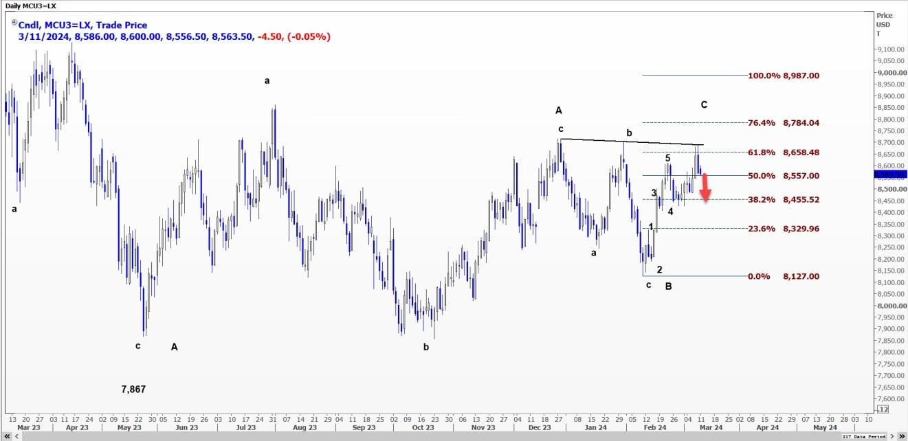 无论哪种情况,人们都高度期望出现适当的调整。跌破8456美元不仅会打开通往8330美元的道路,而且也标志着C浪的完成。