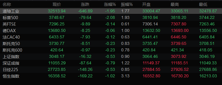 道琼斯工业指数下跌1.95%,至32513.94点。