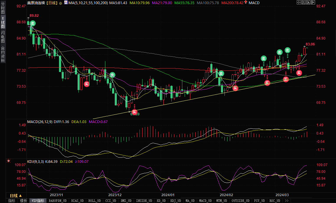 美原油高位窄幅震荡,目前交投于82.73美元/桶附近。油价周一(3月18日)攀升约2%至四个月高点,因伊拉克和沙特阿拉伯的原油出口减少,以及有迹象显示中国和美国的需求和经济增长更加强劲。