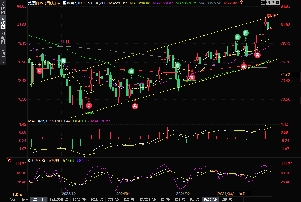 从技术面来看,美原油周二触及了上涨通道上轨,周三下跌后,强化了短线进一步回调信号,投资者需要予以警惕,10日均线支撑在80关口附近,21日均线支撑在78.87附近。