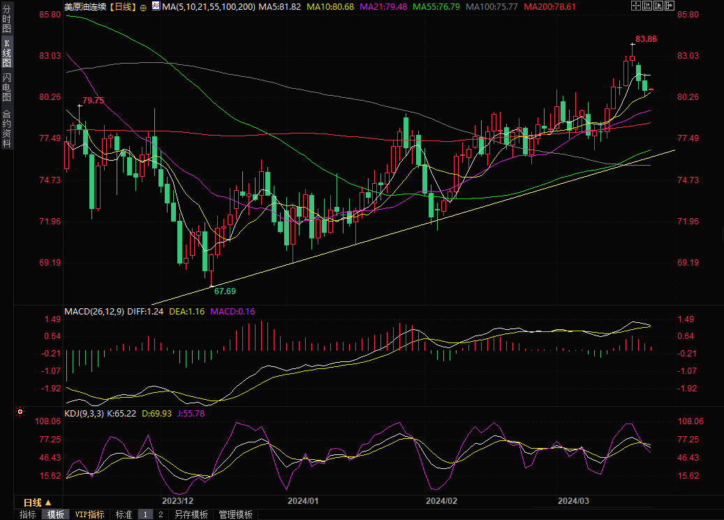 布伦特原油期货收跌0.17美元,或0.2%,至每桶85.78美元;5月美国原油期货收跌0.20美元,或0.3%,至每桶81.07美元,正好触及10日均线附近支撑,前一交易日下跌约1.8%。