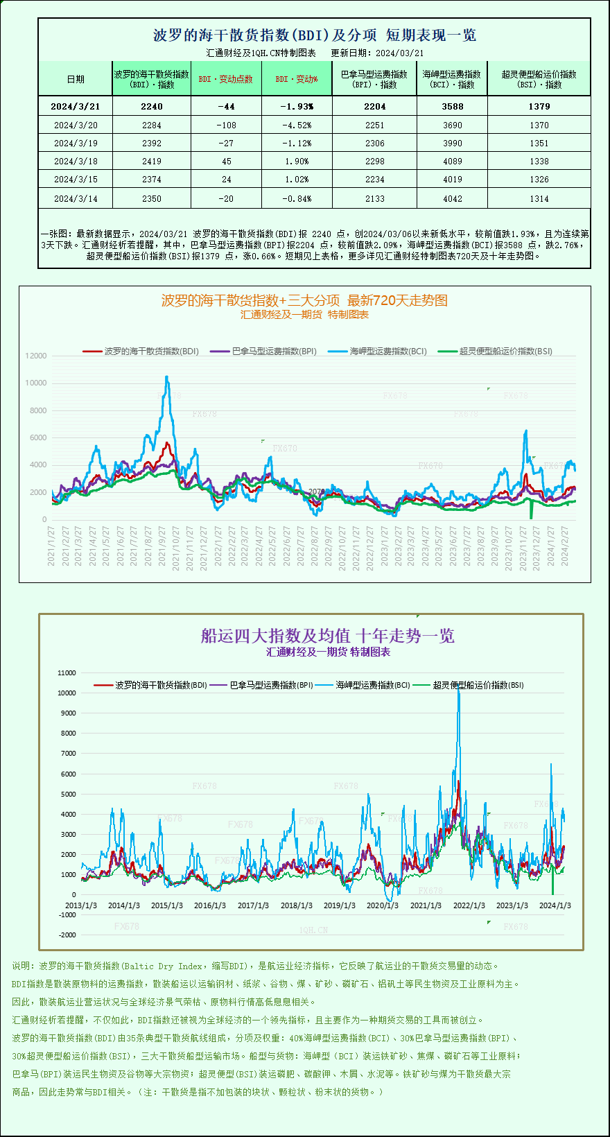 汇通财经APP讯——最新数据显示,2024/03/21 波罗的海干散货指数(BDI)报 2240 点,创2024/03/06以来新低水平,较前值跌1.93%,且为连续第3天下跌。其中,巴拿马型运费指数(BPI)报2204 点,较前值跌2.09%,海岬型运费指数(BCI)报3588 点,跌2.76%,超灵便型船运价指数(BSI)报1379 点,涨0.66%。波罗的海干散货指数+三大分项的最新720天走势图、十年走势图等详见汇通财经特制图表。