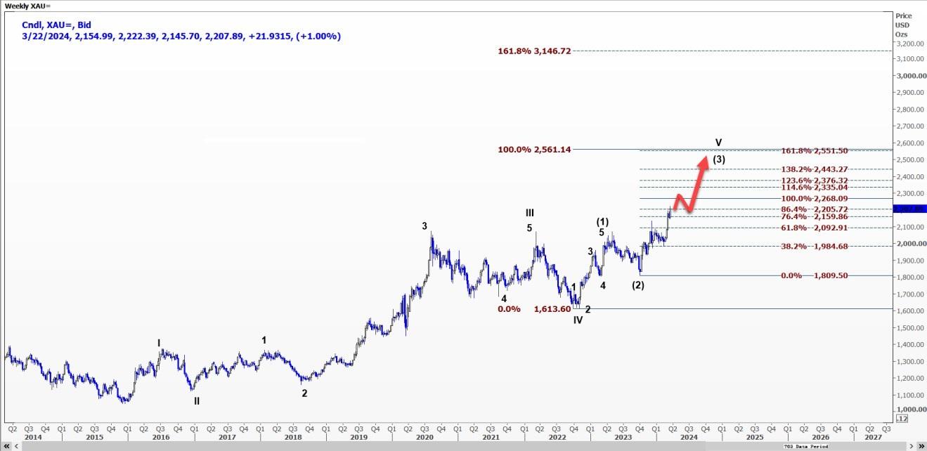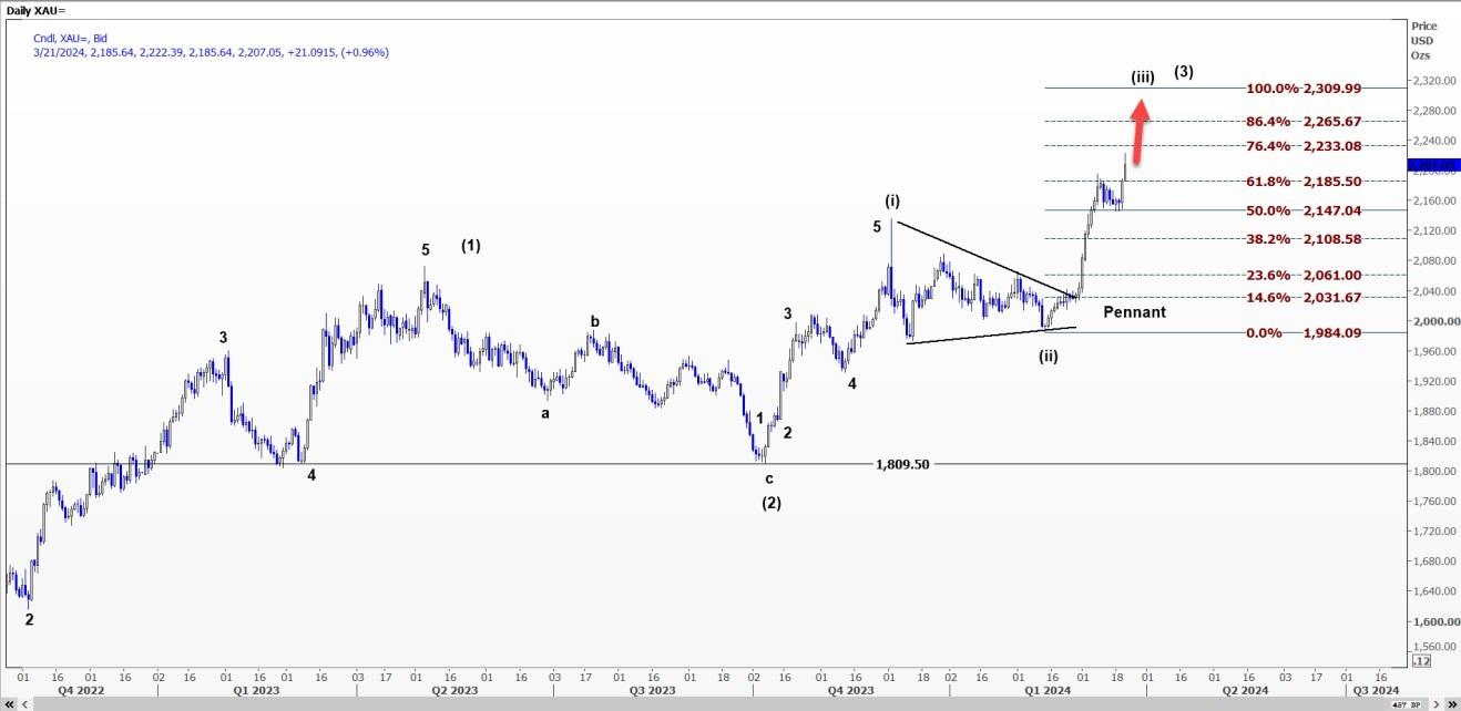 日线图上,从1809.50美元开始的上涨被标记为波浪(I)。对当前浪(iii)的预测分析显示,该浪将突破2186美元的61.8%水平。