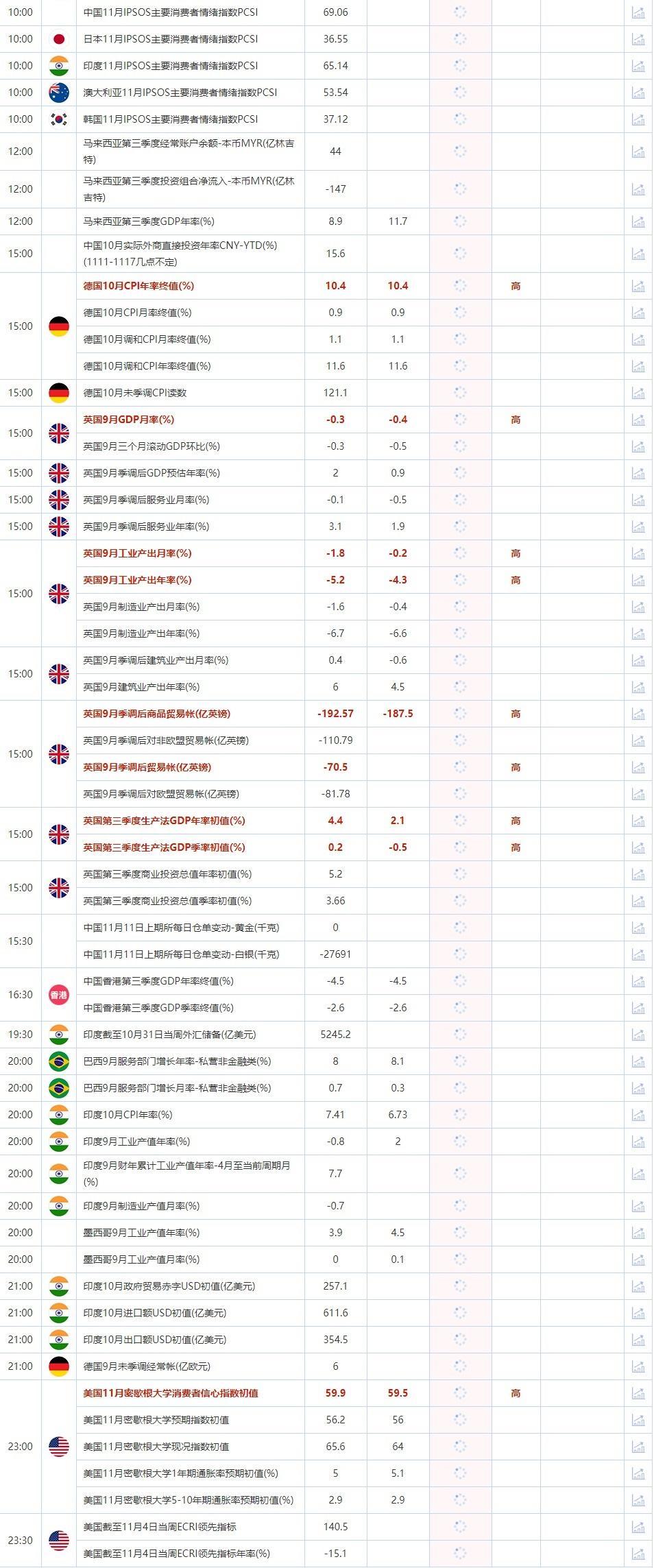 15:00 德国10月CPI年率终值(%) , 前值 10.4 , 预期值 10.4 , 公布值:待发布15:00 德国10月CPI月率终值(%) , 前值 0.9 , 预期值 0.9 , 公布值:待发布