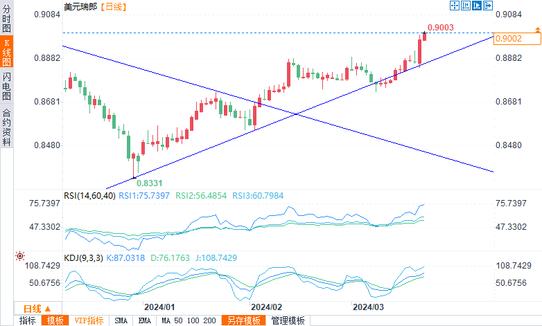 美元兑瑞郎报0.9002,续创去年11月以来新高,日内涨0.31%。