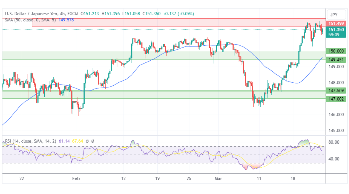 尽管美元/日元最近多次尝试突破并站稳于阻力位151.50-152.00之上,但未能积聚足够的动能。由于日本央行干预的风险,交易员对此保持谨慎态度。然而,从技术面来看,该货币对仍呈上涨趋势,其RSI指标已回归至温和区域。
