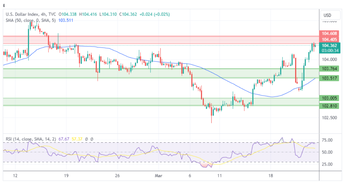 美元指数正努力尝试突破并站稳于阻力位104.40-104.60之上。尽管其RSI指标接近超买区域,但仍拥有足够的空间来获取额外的上行动能。