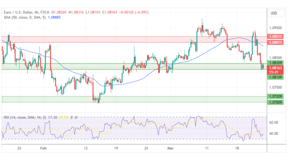 由于交易员对德国的Ifo商业景气报告的反应,欧元/美元正试图收盘于支撑位1.0810-1.0830之下。该报告显示,商业景气指数从2月份的85.7上升至3月份的87.8,超过了分析师普遍预期的86。若欧元/美元成功收盘于1.0810以下,其将进一步走向下一个支撑位,即1.0700-1.0720区间。
