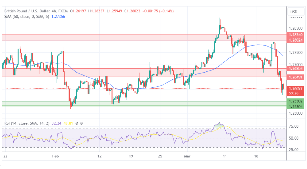 在英国央行最近的利率决策后,英镑/美元仍面临压力,因为该决策显示无人投票支持加息。今日,交易员的关注焦点在于英国零售销售报告,该报告显示2月份零售销售保持平稳。若英镑/美元收盘于1.2600以下,其将走向位于1.2530-1.2550区间的支撑位。