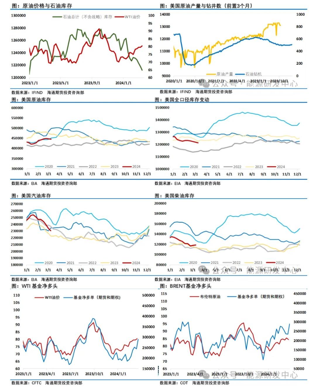 尽管供应端在欧佩克+减产叠加地缘扰动下让市场对供应收紧担忧有所升温,但是油价想要持续上涨还是需要需求端的配合,但过去一周成品油市场表现较为平淡,前段时间表现最强势的美国汽油裂解差近期也表现平淡,上周美国汽油需求有所回落,其他地区汽柴油市场表现均一般,柴油裂解差则全球范围内整体回落。成品油裂解差的表现再次限制了油价的表现。而库存方面持续下降的走势基本印证了原油市场处于供应短缺状态,这也是油价抗跌的重要原因。EIA周报显示美国至3月15日当周除却战略储备的商业原油库存减少195.2万桶至4.45亿桶,降幅0.44%。战略石油储备(SPR)库存增加75万桶至3.623亿桶,增幅0.17%。库欣库存减少1.8万桶,汽油库存减少331桶,预期减少135万桶;精炼油库存增加62.4万桶,预期减少8.7万桶。美国墨西哥湾沿岸汽油库存在最新一周下降至自2021年3月以来的最低水平。原油库存降幅录得2024年1月19日当周以来最大。
