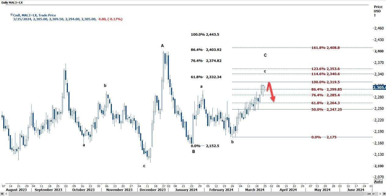 这一波可能会在该阻力位附近结束或延伸至2409美元。支撑位为2285美元,跌破该支撑位可能会确认目标区域为2247-2264美元。