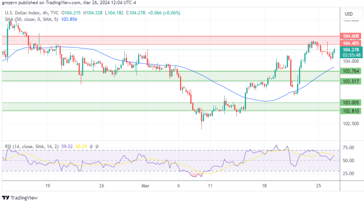 从技术角度来看,美元指数需要稳定在104.40-104.60的阻力位之上才能获得额外的动力。