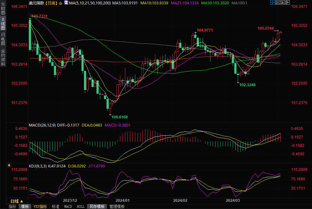 美元指数周一(4月1日)大涨0.45%,最高触及105.07,为11月14日以来新高。周二亚市,