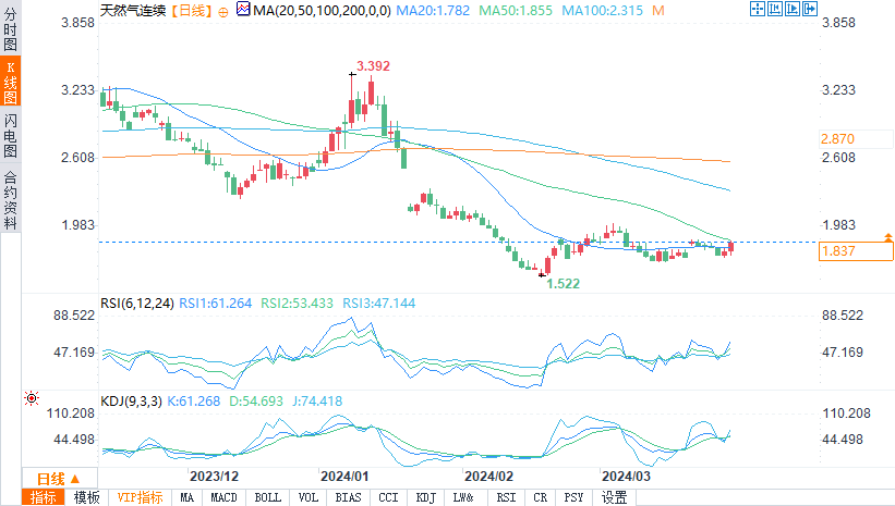 北京时间23:52,天然气期货报1.834美元/百万英热,涨幅4.03%。