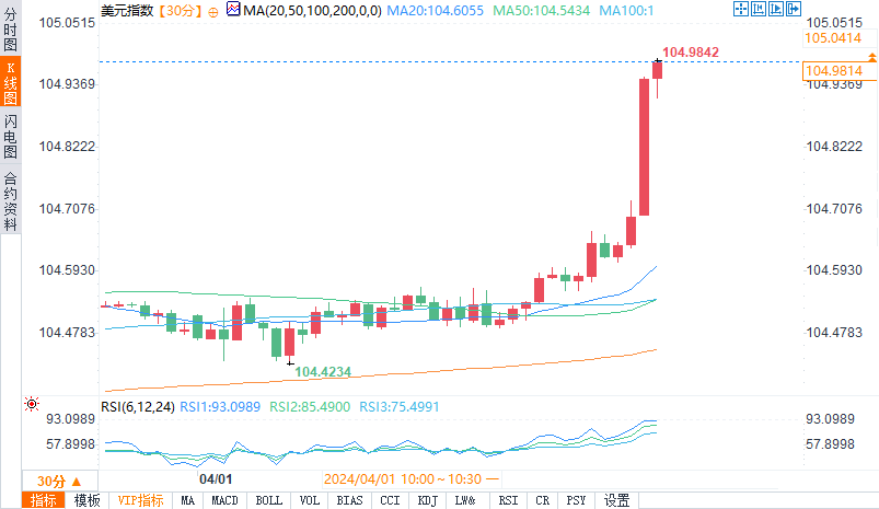 美国制造业数据好于预期,美元指数走高近20点,金价较高位暴跌近30美元